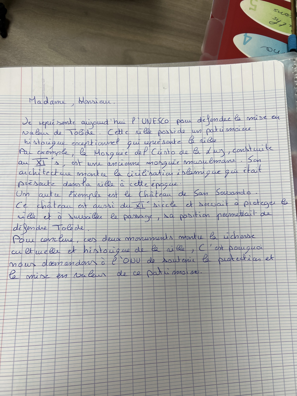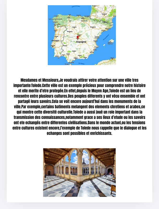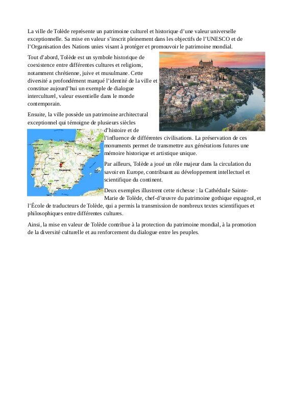 La ville de Tolède possède une grande richesse culturelle. Au Moyen Âge, des chrétiens, des musulmans et des juifs ont vécu dans la même ville. Cette coexistence a permis des échanges entre les cultures, les langues et les savoirs. On peut encore voir aujourd’hui des églises, des mosquées et des synagogues qui témoignent de cette histoire. Cela fait de Tolède un symbole important de dialogue et de diversité culturelle, ce qui correspond aux valeurs défendues par l’UNESCO.
