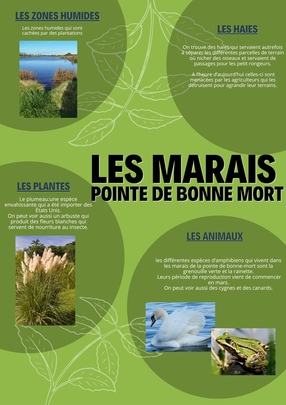 Espèces animales : Nous avons pris connaissance de l’évolution des différentes espèces d’amphibiens qui vivent dans les marais de la pointe de Bonne-mort comme la grenouille verte et la rainette. Leur période de reproduction vient de commencer, c’est pour cela que nous pouvons entendre les chants des amphibiens mâles.
